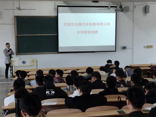 10月20日下午,芜湖市冠豪汽车销售有限公司在北校区教学楼东四阶开展专场招聘会,汽航学院全体毕业生参加了此次会议。
