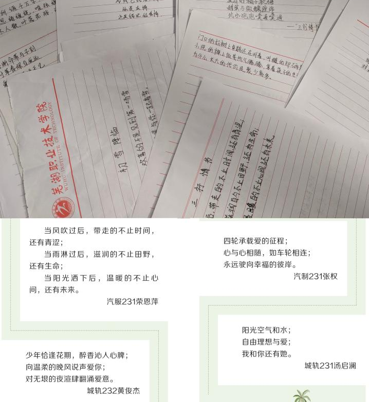 为丰富我院大学生的业余生活,活跃校园气氛,给我院学生提供一个抒发情感、展现自我的平台,11月3日至11月7日汽车与航空学院开展“三行情书 传承爱意”主题活动。此次活动共收到学生来信40余封,经两轮筛选,决出一等奖3人,二等奖5人,三等奖7人。