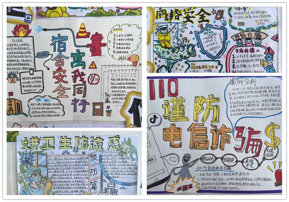 活动中,学生们围绕网络安全、防诈骗、宿舍安全、传染病预防四大主题展开创作。有的作品通过生动漫画揭露网络钓鱼陷阱,有的全方面科普宿舍防火、防盗、用电规范,还有的针对春季传染病高发的问题解析传染病传播途径。一幅幅图文并茂的手抄报既展现了学生的创意巧思,又将安全知识转化为通俗易懂的视觉语言。经初步筛选,学院共展出优秀作品10余幅,在一楼大厅展出。