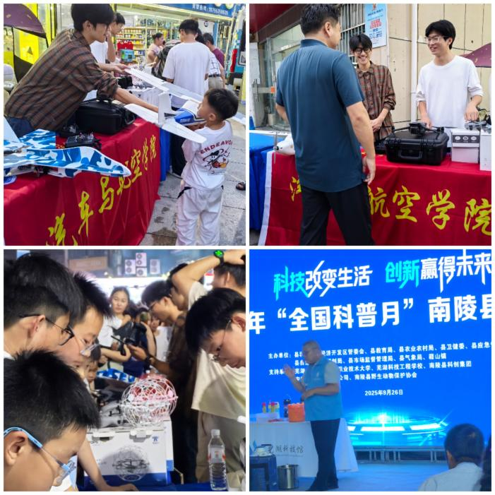 2025年9月26日,应南陵县邀请,我院精心组织专业无人机科普团队,积极参与本年度“全国科普日”南陵县主场活动。团队由学院团委书记卓小文老师和芜湖市科技特派员尹涛老师共同带队,与多名优秀学生联合组成,携多款涵盖不同技术层级与应用场景的无人机设备亮相现场,全面呈现无人机科技的发展成果与实用价值。