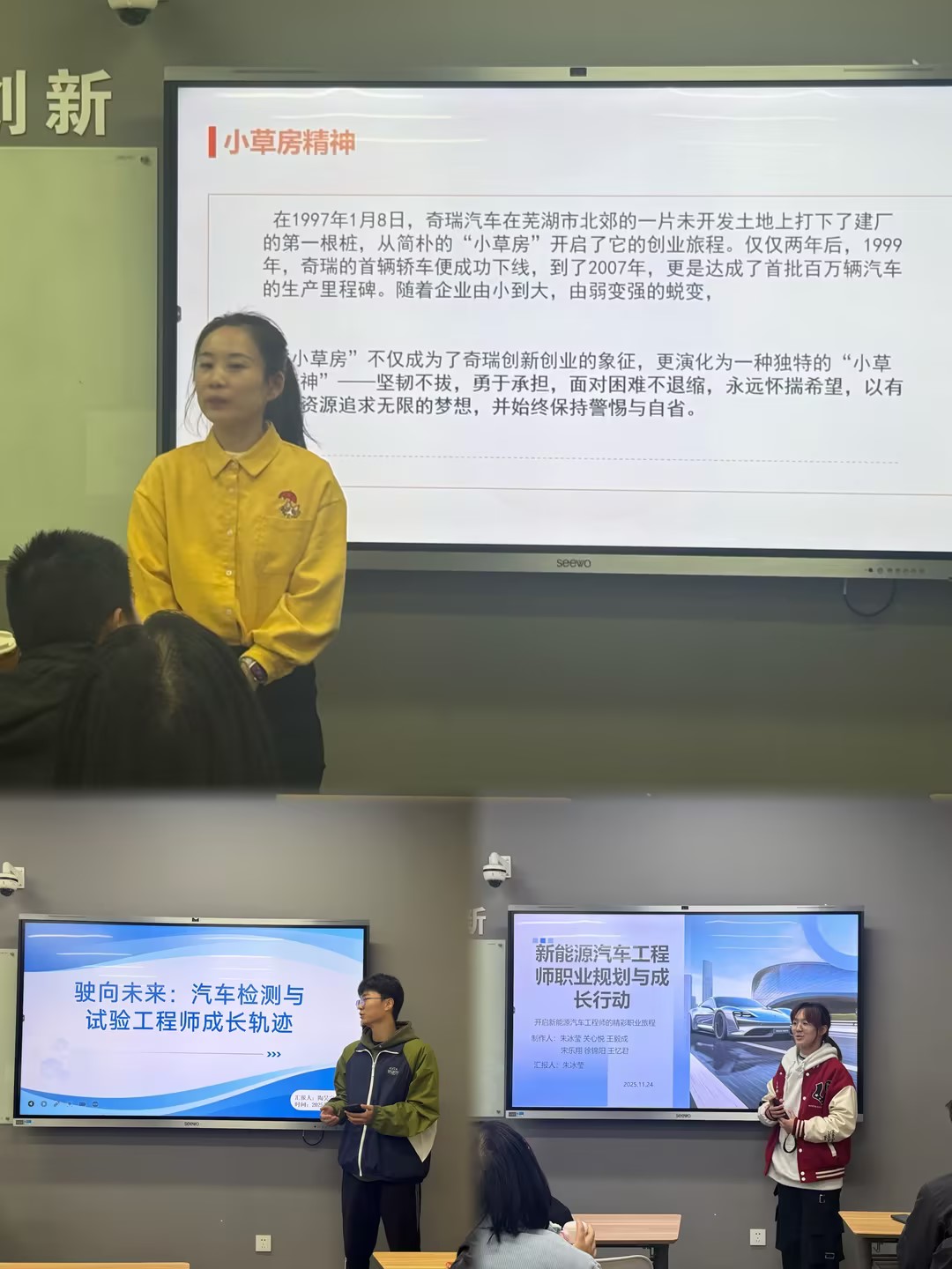 课堂上,王茜老师通过影像资料、历史故事、典型案例相结合的方式,生动诠释了奇瑞创业初期“白手起家、艰苦奋斗、自主创新、追求卓越”的“小草房精神”。从简陋厂房中的技术攻坚,到民族汽车品牌的崛起之路,从技术人员的坚守初心到企业发展的责任担当,一个个鲜活事例让学生们深刻理解了“小草房精神”的时代内涵与实践价值。