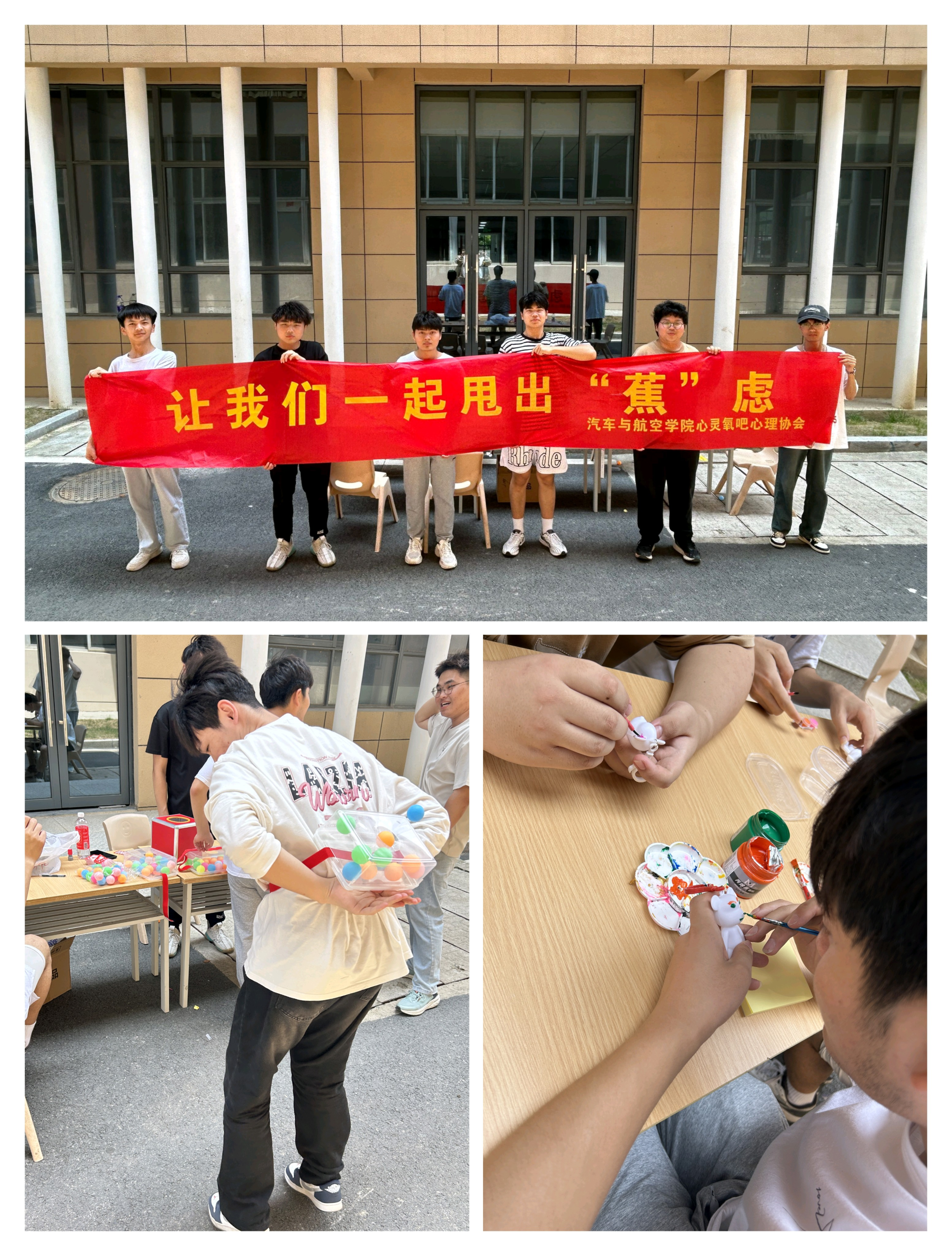 为进一步提升心理育人质量,培育学生自尊自信、理性平和、积极向上的健康心态,普及心理健康知识,5月24日,在汽车与航空学院党总支的指导下,学院心灵氧吧心理协会举办了一场以“让我们一起甩出“蕉”虑”为主题的心理解压运动会。
