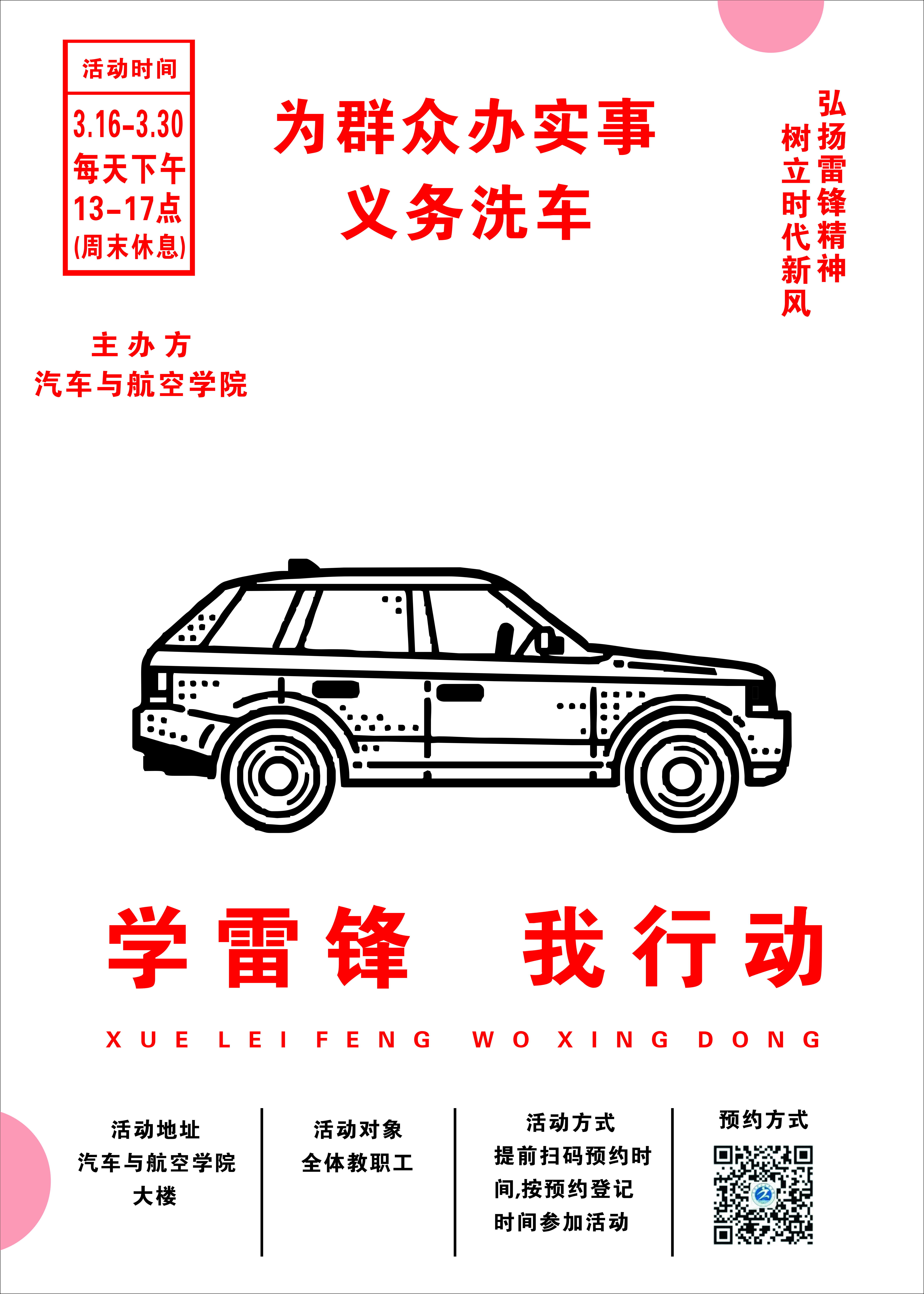 为积极践行以人民为中心理念,切实为人民群众办实事、做好事、解难题,用贴心的服务、暖心的态度,把党的关怀和温暖送到群众身边,汽车与航空学院党总支将理论学习与专业紧密结合,依托专业优势,结合学雷锋月,组织开展“学雷锋,我行动—义务洗车”活动。