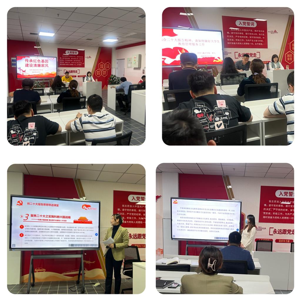 4月19-26日,4位总支成员走上讲台,结合工作岗位实际聚焦二十大精神给全体教职工带来了系列微党课。党总支副书记唐飞、组织委员周自宝、纪检委员张弛、统战委员梅源分别以《践行党的二十大精神,做好学生教育管理工作》、《传承红色基因,建设清廉家风》、《学习二十大,推动高校廉洁文化教育系统发展》、《聚焦三方面,将二十大报告思想带进课堂》为题,给合工作实际谈认识、谈感想、谈体会,从不同角度一起分享对党的二十大精神的理解,激发了党员干部学习党的二十大精神的热情、展示了全院党员干部良好的风貌。