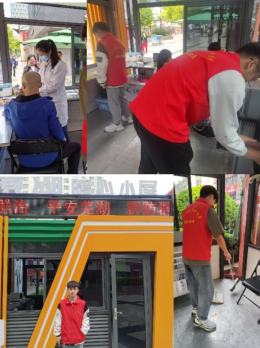 本次活动地点位于镜湖区步行街暖心小屋。志愿者们主要负责针对当日公益活动,盘点小屋中公益物料,及时做好物料领用登记确保当日公益项目的正常运行;并在协助完成给老年人量血压、发放雨衣等公益活动后,及时收集居民有关公益服务相关需求和保证暖心小屋的卫生清洁。