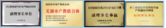 2023年12月当选为全国智能网联汽车测试评价行业产教融合共同体副理事长单位;2023年12月当选为长三角智能网联汽车行业产教融合共同体副理事长单位;2023年9月,与经开区、奇瑞汽车作为政、企、校三方联合理事长单位,成功申报国家级市域产教联合体;2023年7月当选为长三角新能源行业产教融合共同体副理事长单位;2023年9月入选现代职业教育科教融合共同体-新能源汽车专委会成员单位;与北京理工大学、奇瑞汽车联合申报成功国家级职业教育装备制造大类汽车制造类(新能源汽车)“双师型”教师培训基地;与奇瑞汽车签约“国家现场工程师联合培养项目”等。